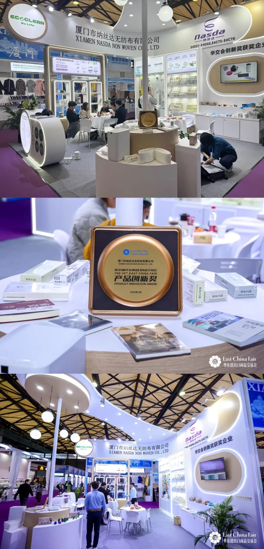 展会上,厦门企业创新成果亮眼,厦门市纳丝达无纺布有限公司与厦门中昱进出口贸易有限公司凭借突出的创新实力,斩获产品创新奖。厦门市纳丝达无纺布有限公司的核心产品“四吸材料”为无胶混纺技术打造的多功能复合材料,集吸味、吸音、吸热(隔热)、吸水/吸油四大功能于一体,攻克了“无胶颗粒物与纤维混纺技术”,实现从化学胶黏剂“胶束缚”到纯物理工艺“物理赋能”的突破,提升了性能,实现了一材多效,确保了材料在生产、使用和废弃全周期的生物相容性与环境友好性,以材料创新驱动绿色健康发展。开展前两天他们就收到了60多张客商名片。