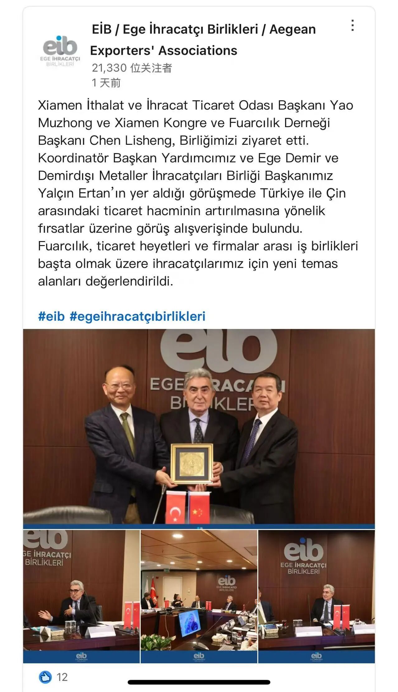 为进一步拓展我市外经贸企业业务渠道,增强项目合作,3月10至12日,我会会长姚木中、厦门市会议展览业协会会长陈李升一行先后拜访了我市友城土耳其伊兹密尔市的核心会展机构伊兹密尔会展公司(IZFAS)以及重要区域性出口商联盟爱琴海出口商协会(Aegean Exporters’ Associations,简称EIB),围绕展会合作、经贸对接等内容开展深入交流,推动两地务实合作取得新进展。